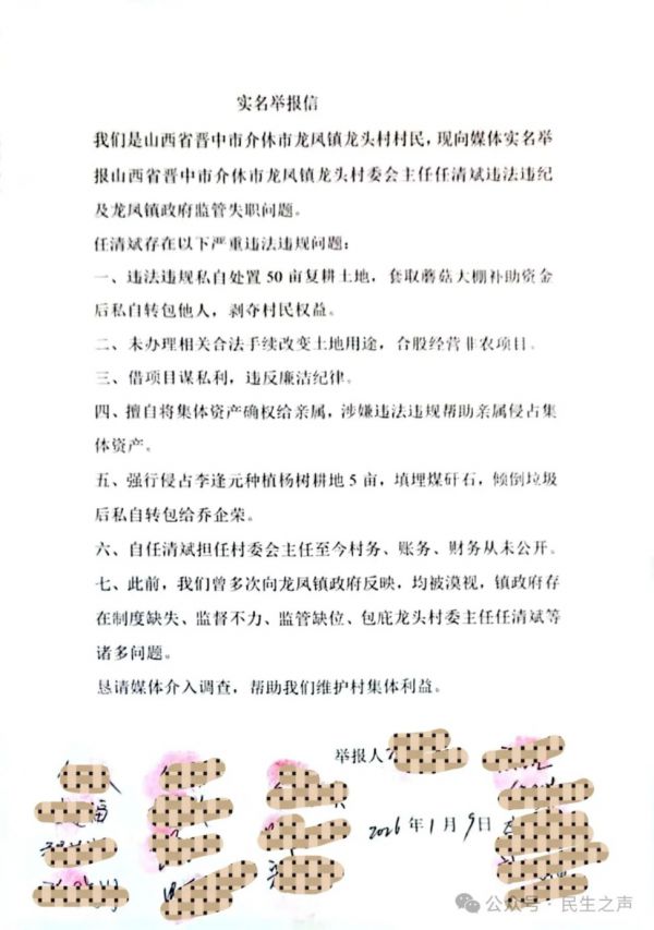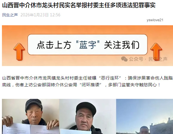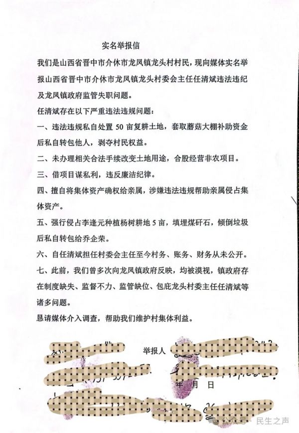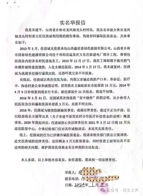 村民泣血呼吁:彻查恶行、问责失职,还公道于乡邻“骗国家的钱、养黑恶的人、害无辜的命,勾结干部逃避制裁,连上访到公安部都没用——这样的人凭什么当村委主任?”参与举报的村民红着眼眶质问。任某斌的行为已涉嫌诈骗罪、非法占用农用地罪、重大责任事故罪、组织领导参加黑社会性质组织罪等多项罪名,任某斌多次逃脱制裁,更让村民对基层治理的信任跌至冰点。如今,龙头村村民通过媒体向晋中市纪检委、介休市新任纪委李书记提交举报材料,以人格与法律名义为举报内容背书,提出四点诉求:1. 依法对任某斌立案侦查,彻查其骗取医保、套取国家资金、涉黑涉恶、违法施工致人身亡受伤等全部犯罪事实,追究刑事责任;2. 深挖介休市纪检领导的渎职行为,查清其与任某斌利益勾结细节,依规依纪依法严肃处理,斩断“保护伞”;3. 严肃问责介休市纪委“执法不严、故意包庇”的主管领导,追究龙凤镇党委政府“监管失职、放任恶行”的责任,督促介休市公安局立即重启骗取国家医保资金、宋建平工伤案件调查,还伤者公道;4. 全程公开案件调查结果与处理情况,接受村民与社会监督,重塑基层纪检监察与政府部门公信力,让法治阳光照进乡村。“我们不怕报复,只求上级部门来看看我们的处境,还龙头村一片干净的天,还霍长青、宋建平这些受害者一个说法!”村民的诉求质朴却坚定,字字浸透着对正义的渴望。这场关乎基层法治尊严、民生权益保障的斗争已拉开序幕,所有人都在等待一个公正结果——让乡村重拾安宁,让民心重归信任。